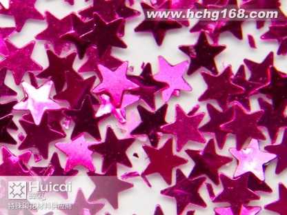 金葱粉:又名闪光片。包括铝质金葱粉,聚酯金葱粉,幻彩粉,镭射金葱粉等。有铝质,PET,PVC材质。大小规格(size)由1/2560、1mm)至1/83、0mm)。形状有六角形,四角形,长条针形和不规则形状,并有多种颜色可供选择。各种材质金葱粉可不同程度承受高温(由80*C,180*C,300*C不等) 。